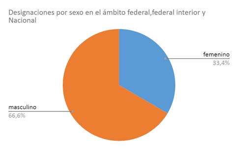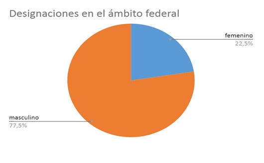 Por otra parte, la brecha de género se acentúa más en el ámbito federal donde el 78% de las personas designadas fueron hombres y el 22% mujeres.