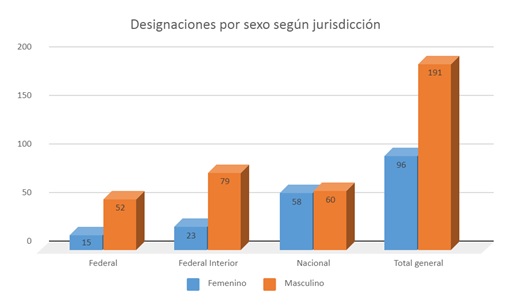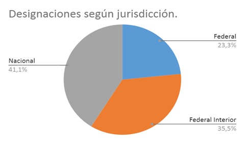 Por otra parte, el 63% de las designaciones fueron en la jurisdicción federal del interior, el 11% en el ámbito federal de la CABA y el 12% en la Justicia Nacional.
