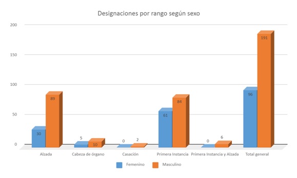 Al analizar los rangos de las designaciones se observa una notoria desigualdad de género en la distribución de los cargos de poder. De los 287 nombramientos, 145 tuvieron lugar en la Primera Instancia: de ese total el 58% está compuesto por hombres y el 42% por mujeres.