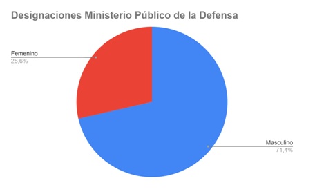 Durante los últimos cuatro años hubo 35 designaciones en el Ministerio Público de la Defensa. La mayor cantidad de nombramientos se produjeron durante el 2017. El 71% corresponde a personas de sexo masculino y el 29% al sexo femenino.