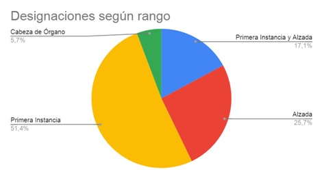 Asimismo, el 38% de los nombramientos fue para cargos en los organismos de Alzada y otro 38% fue en cargos del seno de la Procuración General de la Nación. El 24% restante se asignó a la primera instancia.
