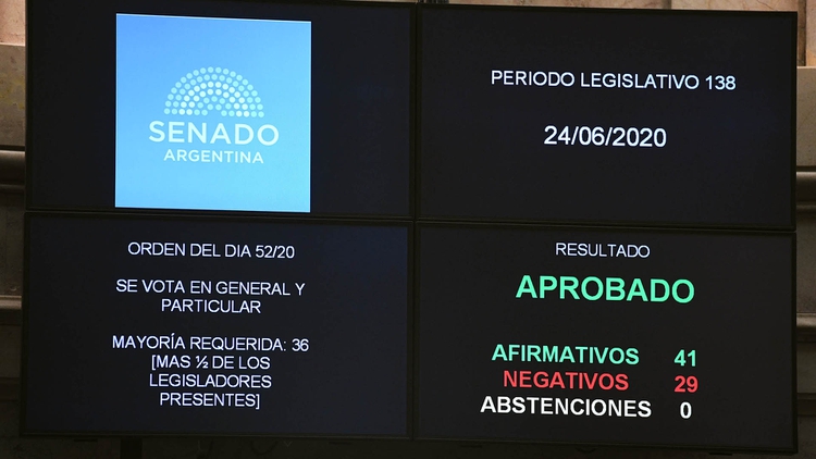 En definitiva, el proyecto sometido a votación particular y general, obtuvo 41 votos afirmativos y 29 emisiones por la negativa. Por lo que, ante la mayoría requerida de mitad de los senadores y las senadoras presentes para su aprobación, la Cámara Alta del Congreso dio media sanción al mismo.