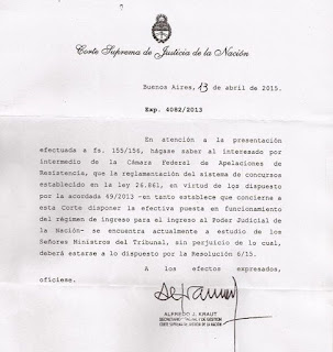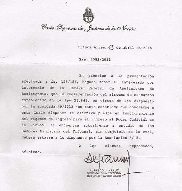 La extensa demora en la implementación del mecanismo de ingreso democrático previsto en la ley 26.861 cuya autoridad de aplicación es la Corte Suprema de Justicia motivó diversos reclamos como, por ejemplo, un ciudadano chaqueño que hizo llegar su exigencia por el cumplimiento de ley ante la Cámara Federal de Resistencia que lo elevó al Máximo Tribunal el cual, a través de la Secretaría de Gestión, le contestó lo siguiente: