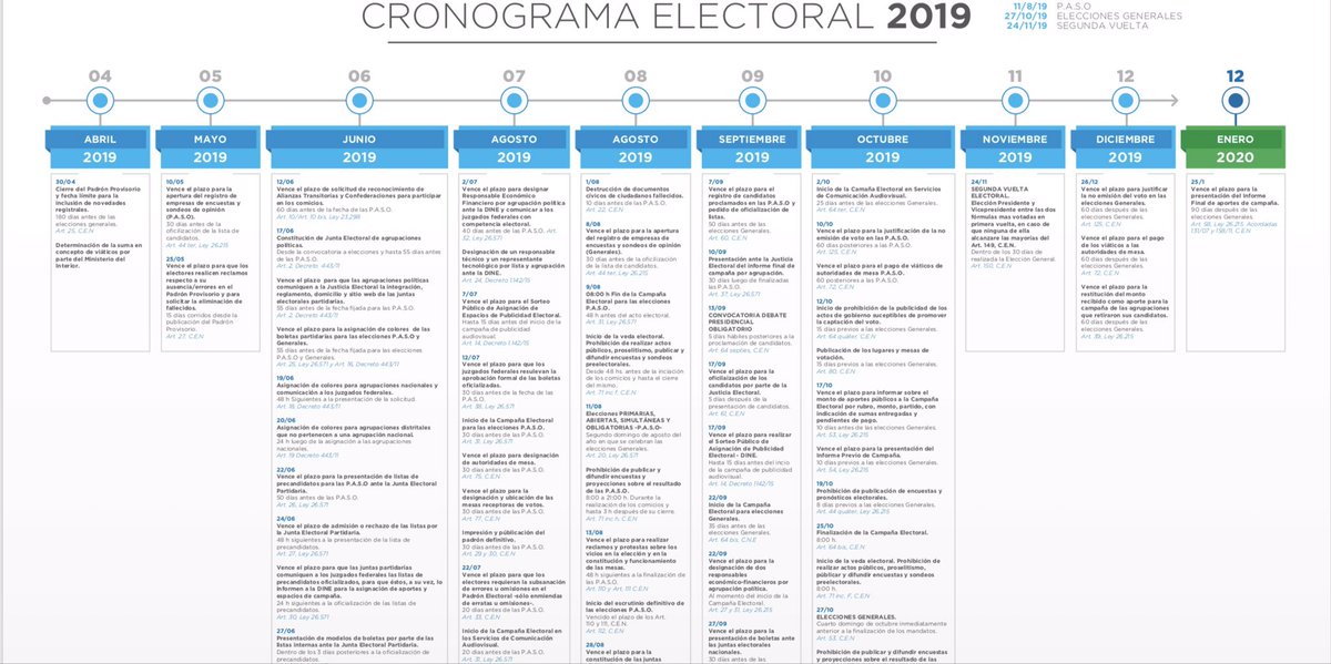 La Dirección Nacional Electoral publicó el calendario electoral para el 2019. Las PASO serán el el 11 de agosto de 2019, el 27 de octubre serán las elecciones generales y el 24 de noviembre se realizará la segunda vuelta.