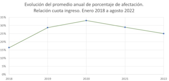 De la misma manera, analizan la relación cuota ingreso, sosteniendo que “el nivel de afectación de la cuota sobre el ingreso total no superó nunca el promedio anual del 32,98% (correspondiente al año 2020, que probablemente fue el peor de la crisis sanitaria y del A.S.P.O.)”