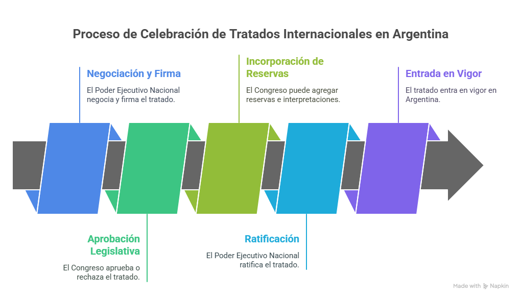 Se trata de un “acto federal complejo” donde intervienen el Poder Ejecutivo Nacional y el Poder Legislativo. El Poder Ejecutivo Nacional titulariza la facultad de negociar y firmar los tratados (en los términos previstos por el art. 99 inciso 11 de la Constitución argentina), luego el Congreso tiene la potestad de aprobar o desechar los tratados (en los términos establecidos por el art. 75 inciso 22 de la Constitución argentina) mediante la forma de ley (que no implica función o actividad legislativa) y si los aprueba puede incorporar reservas y declaraciones interpretativas al texto del tratado, y por último, el Poder Ejecutivo Nacional (en los términos previstos por el art. 99 inciso 11 de la Constitución argentina) ostenta la capacidad de ratificar el tratado en sede internacional (realizando las reservas y declaración interpretativas pertinentes en la medida que el Congreso haya otorgado la aprobación sin consignar modificaciones o reservas). Una vez ratificado por parte del Poder Ejecutivo Nacional un tratado entra en vigor para el Estado argentino (siempre y cuando se encuentre vigente en el ámbito internacional), adquiere jerarquía supralegal y debe ser aplicado en sede interna.[12]